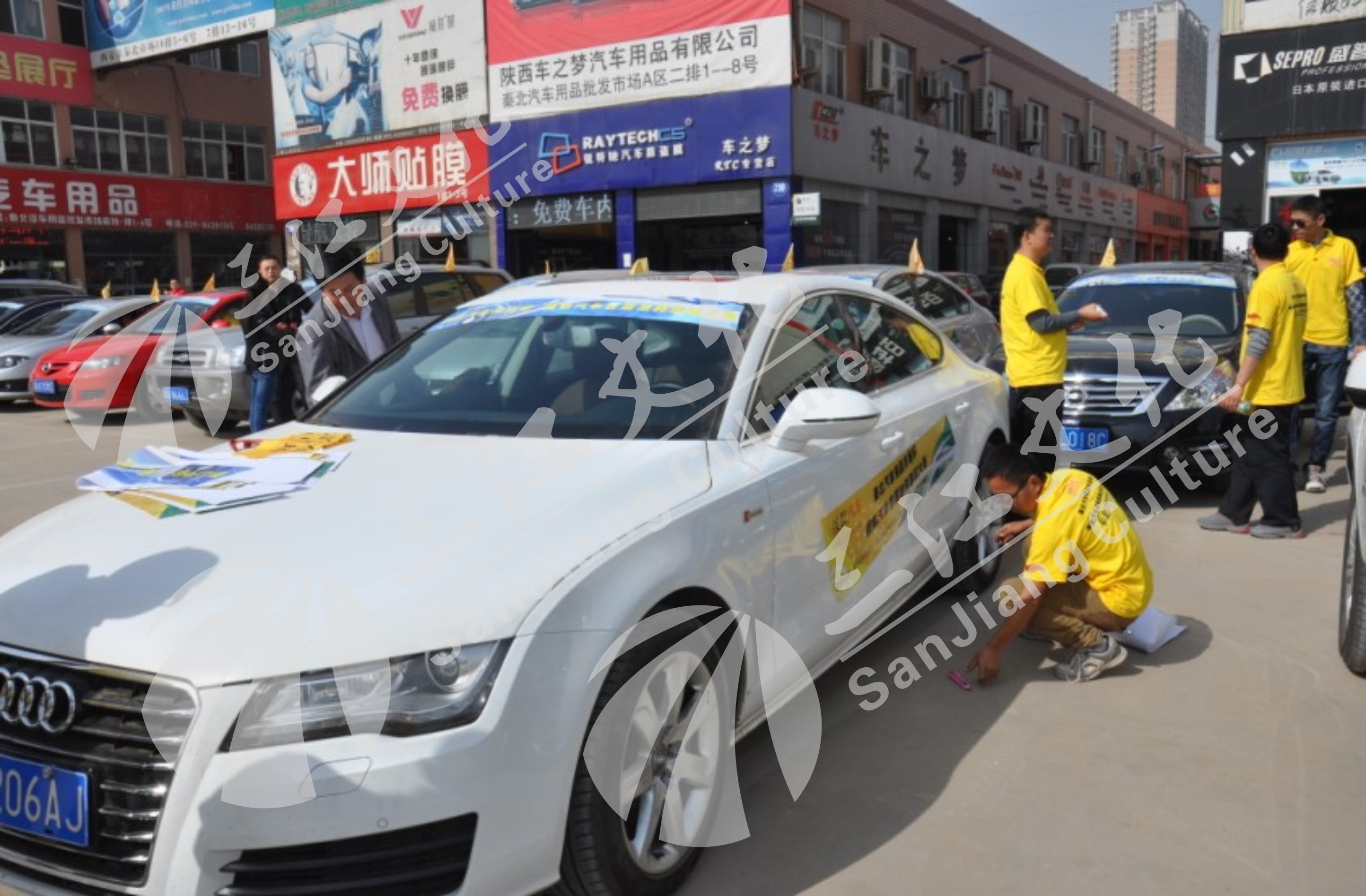 三江广告工作人员在贴车贴